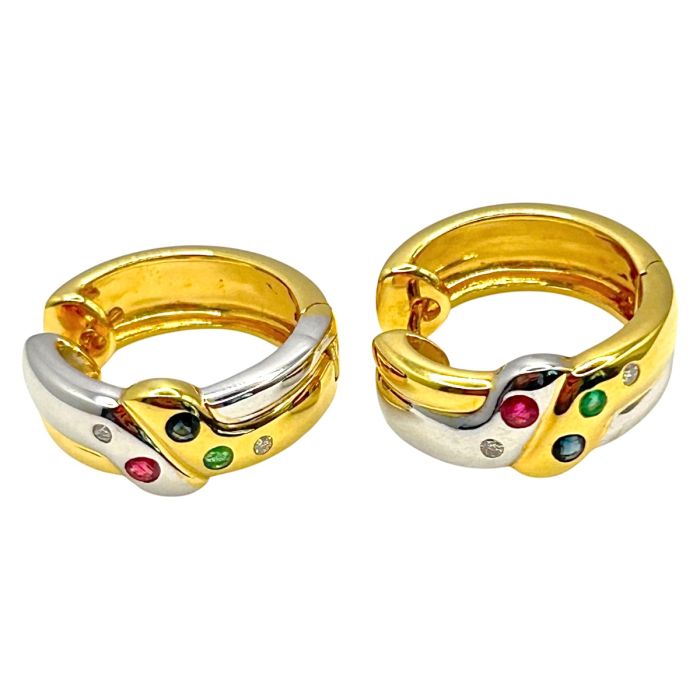 Mit dem strahlenden Edelsteinen werden diese Schmuckstücke zum funkelnden Highlight. Besetzt sind sie mit je einem Smaragd, einem Saphir, einen Rubin und 2 Diamanten.