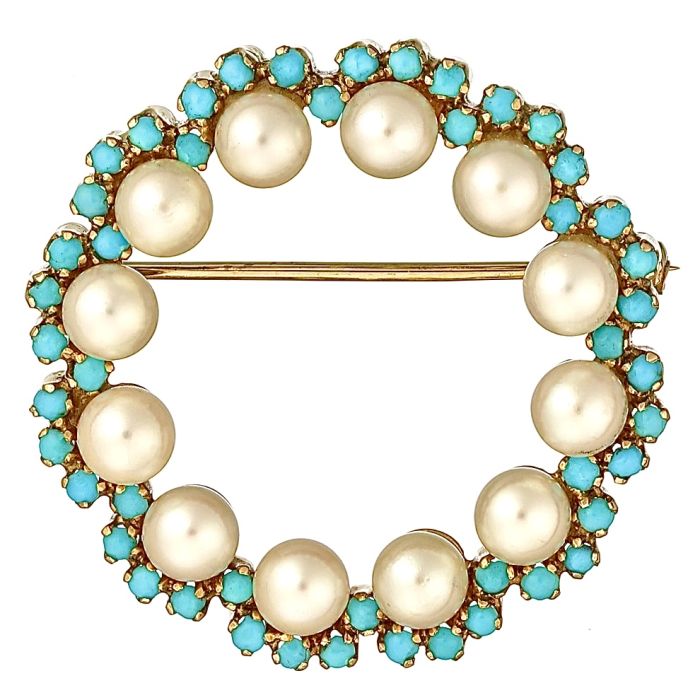 18-karätige Brosche in der Form eines Blütenkranzes mit 12 Zuchtperlen, umgeben von insgesamt 50 kleinen Türkisen.
