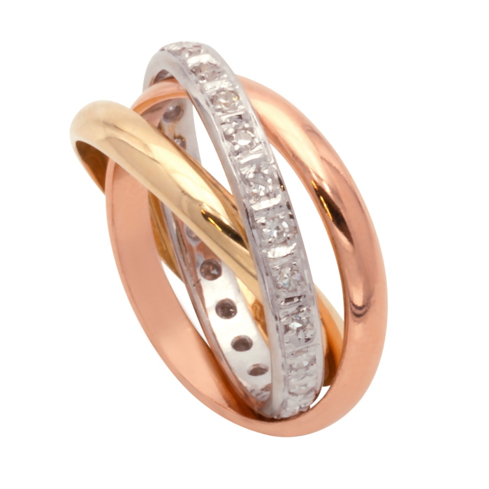 Drei ineinander verschlungene Ringe jeweils einer aus Roségold, einer aus Gelbgold und einer aus Weißgold ergeben dieses tolle Schmuckstück.