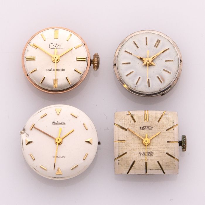 Uhren von Cito, Habmann, Wega und Roxy. Vollständige Ziffeblätter, eins mit Beschädigung am Rand, 1 Krone und 1 Krone mit Welle fehlen.