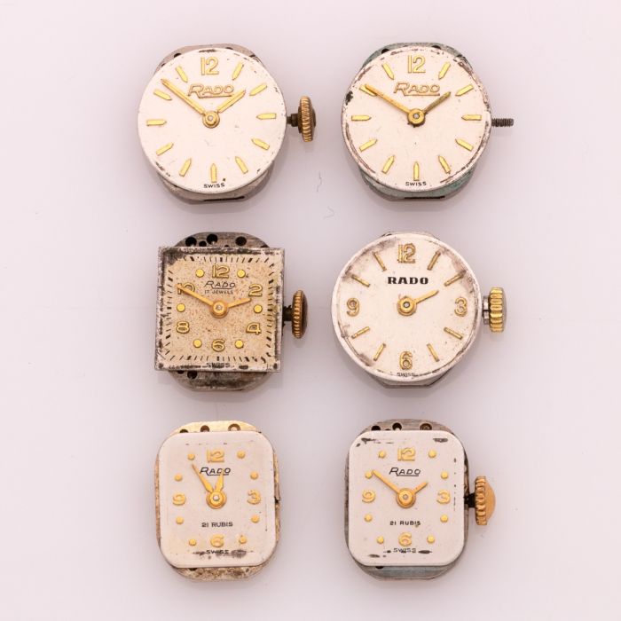 Uhrwerke des Herstellers AS (Adolph Schild SA, Grenchen/Schweiz) Kaliber 976 (fünfmal) und 1012 (einmal), alle mit Prägung der Uhrenfabrik RADO.