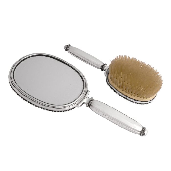 Es  besteht aus einem Handspiegel und einer Haarbürste mit profilierten Rahmen sowie Griffen mit plastischem Spiralband-Dekor.