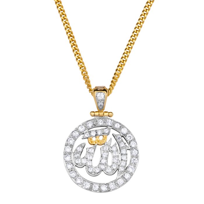 Das Schmuckstück hat eine runde flache Form und ist mittig mit dem Zeichen Allahs versehen.