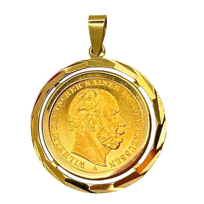 Großer, auffälliger Kettenanhänger mit einer 20 Mark Goldmünze gefasst. Der Avers der Münze, welche aus 900er Gelbgold gefertigt ist, der 20 Mark Reichsgoldmünze zeigt Wilhelm, den deutschen Kaiser König von Preussen. Auf der Rückseite ist das Staatswappen in Form des Reichsadlers zu sehen, am Münzrand steht "DEUTSCHES REICH", der Nennwert "20 MARK" und das jeweilige Prägejahr,in diesem Fall 1888.