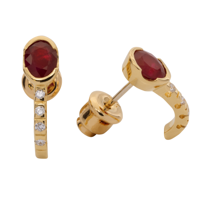 Geziert werden sie von je einem Rubin in Ovalschliff. Darunter funkeln je 4 Brillanten, welche aneinandergereiht einzeln gefasst sind. D