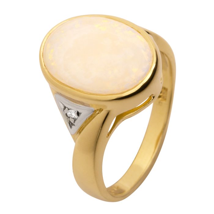 Das Schmuckstück hat eine hochglanzpolierte Ringschiene, die in den großen ovalen Ringkopf übergeht. Dieser ist gleichzeitig die Fassung für den großen hellen Opal, welcher von jeweils einem Brillanten in weißgoldenen Fassungen flankiert wird.
