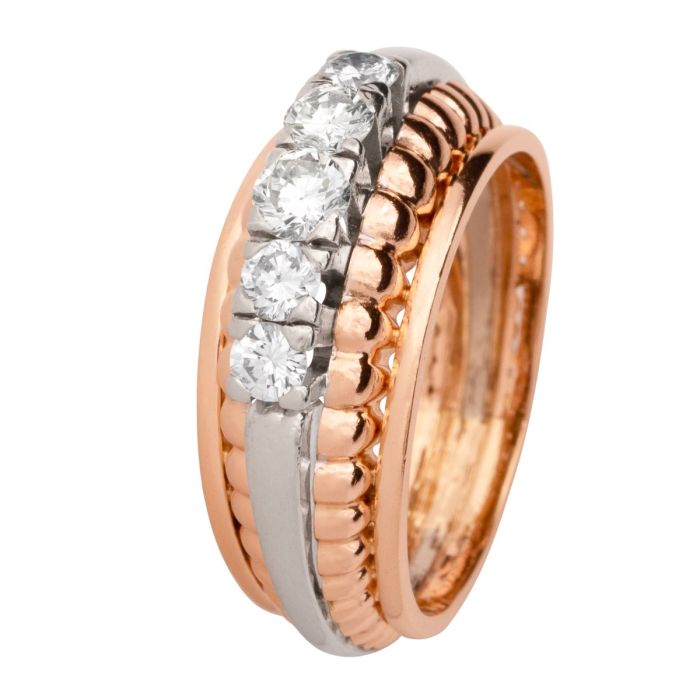 Das Schmuckstück hat eine rotgoldene Ringschiene welche mit einem hübschen Dekor versehen ist.