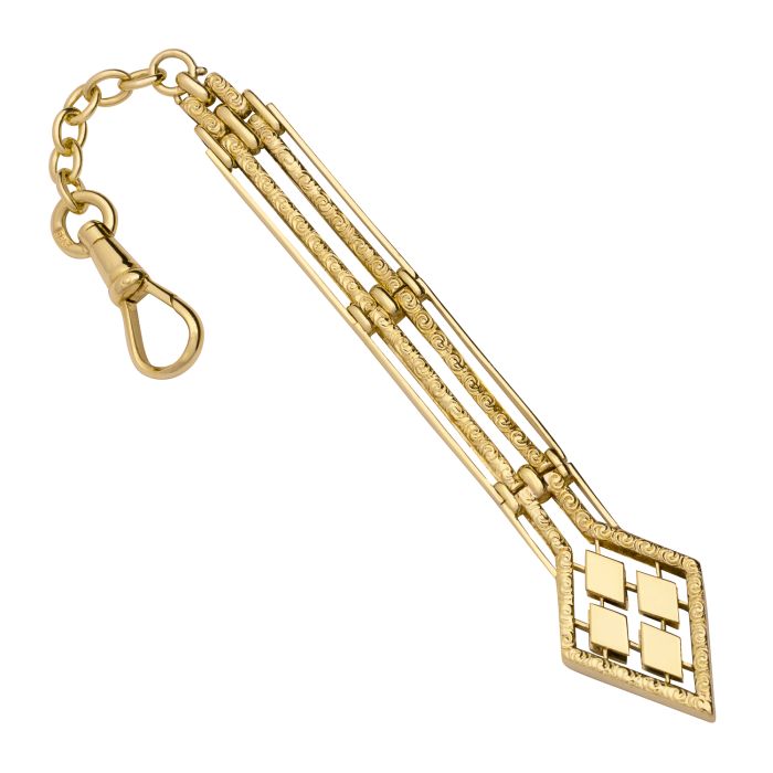 Zum Befestigen der Taschenuhr ist ein Karabiner vorgesehen, welcher an einem Kettchen befestigt ist. Das Schmuckstück hat längliche Glieder. Diese sind teils satiniert gearbeitet. Das Endstück ist ein Rauteartiges Element mit kleinen hochglanzpolierten Rauteförmigen miteinander verbundenen Plättchen innen.