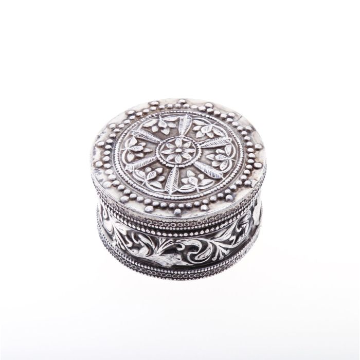 Antikes Döschen zum Aufbewahren verschiedenster Dinge. Florale Ornamente zieren dieses hübsche Stück sowohl am Rand als auch auf dem Deckel etc.