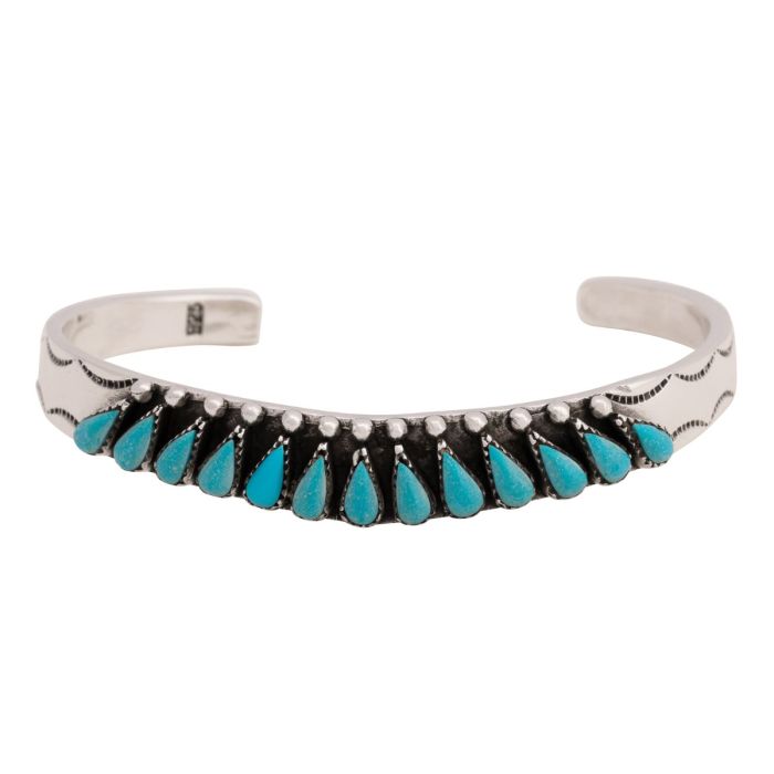 Die Armspange in Sterling-Silber ist schauseitig besetzt mit Türkisen in Needlepoint-Technik der Zuni-Indianer.