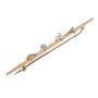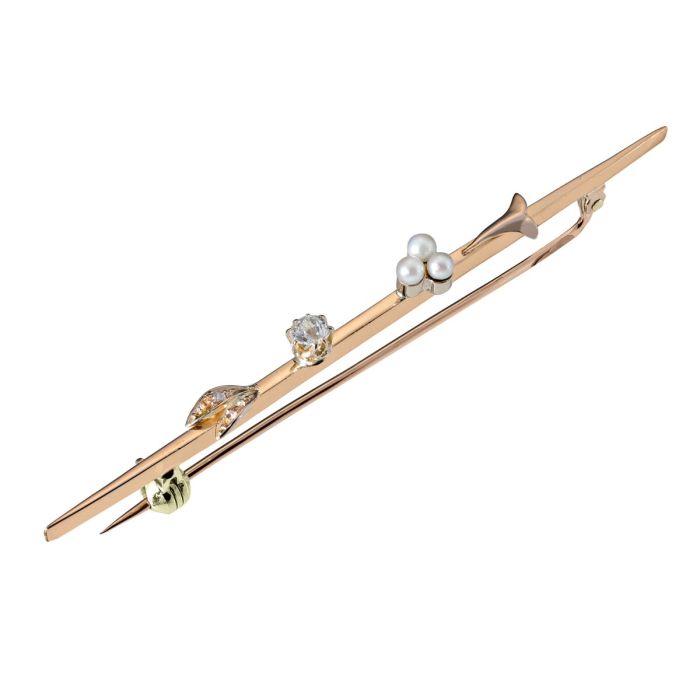 Aparte Jugendstil-Brosche, um 1890, mit schmaler Vierkantnadel besetzt mit dezenten Floral-Elementen und einem Altschliff-Brillanten ca. 0,15 ct. (Crystal, Si) in Krönchenfassung mit Krappen, 3 Saatperlen (D. zw, 2,3 – 2,4 mm) sowie zwei kleinen Diamantrosen, zwei fehlen.