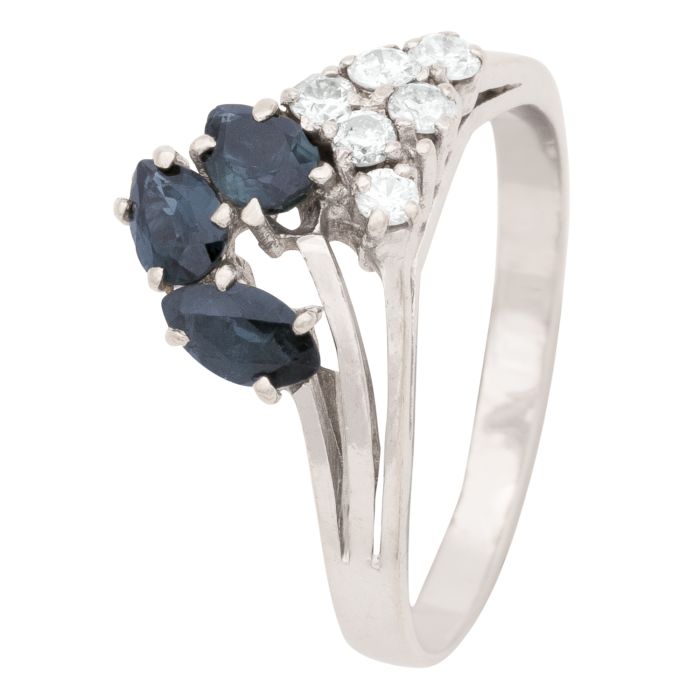 Das Schmuckstück mit dreieckig gestaltetem Ringkopf in geometrisch/floraler Form ist besetzt mit 3 Saphiren in Tropfen- und Navetteschliff und 6 Brillanten von zus. ca. 0,20 ct.