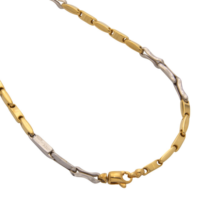 Abwechselnd gelbgoldene und weißgoldene Glieder in verschiedenen Gliederformen reihen sich aneinander. Sie haben eine hochglänzende Oberflächenveredlung.
