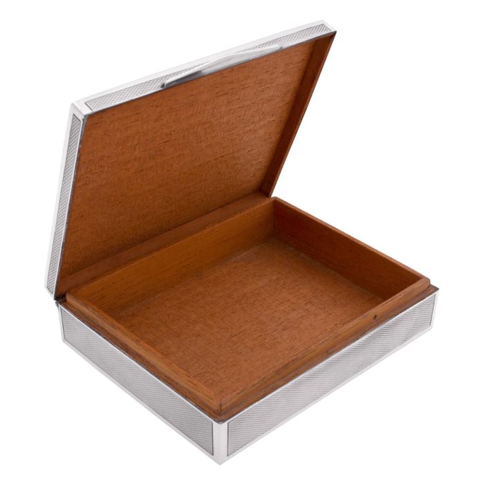Der wellen-guillochierte Deckel und die Seiten haben polierte Kanten. Die große Daumenrast ist leicht geschwungen und der Holz-Boden mahagonifarben gebeizt.