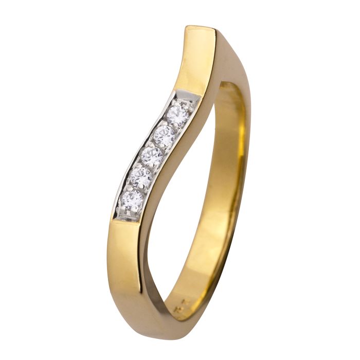 Das schauseitige Stück Ringschiene hat eine ausgefallene geschwungene Form. Im mittleren Teil entlang verläuft eine Reihe mit 5 aneinandergereihten Zirkonia in weißgoldenen Kornfassungen.