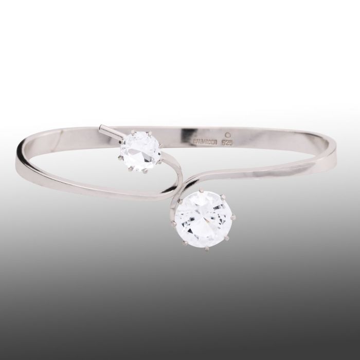 Er ist hochglanzpoliert gearbeitet und fasst schauseitig in 2 schönen Krönchenfassungen je einen funkelnden Zirkonia in unterschiedlichen Größen.
