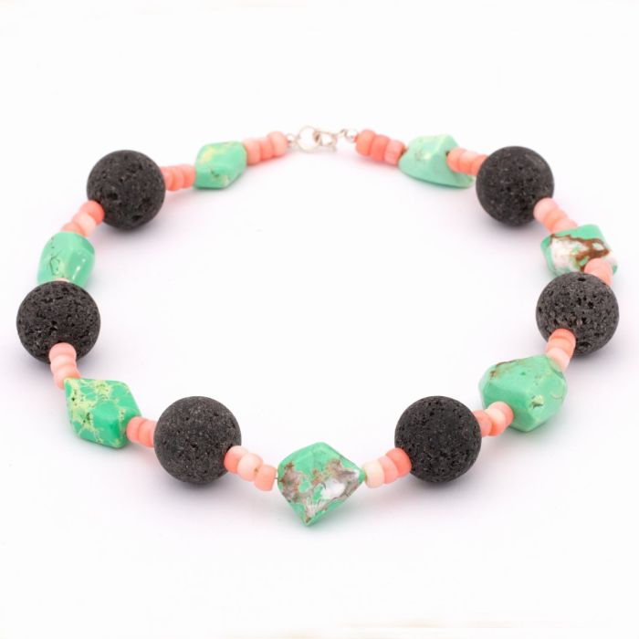 Auffällige Damenkette aus runden Lavasteinen, Bambuskoralle und gefärbter Koralle im Wechsel aneinandergereiht.