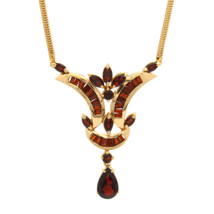 Die massive Schlangenkette geht direkt in das Schaustück über. Dieses ist besetzt mit 35 synthetischen Schmucksteinen in einem rötlich braunen Ton. Sie sind in verschiedenen Schliffen verarbeitet. Trapez, und Baguetteschliff, Navetteschliff und rund facettierte. Der große Stein im unteren Teil hat eine Tropfenform.