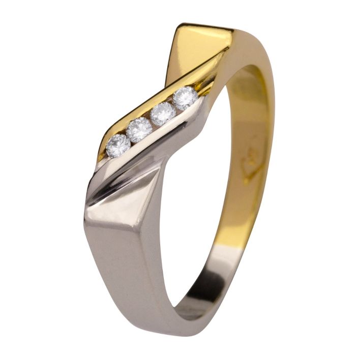 Der Ringkopf ist kantig und hat mittig ein Band in dem 4 Brillanten sitzen. Diese sind die Trennung zwischen den beiden Goldtönen.
