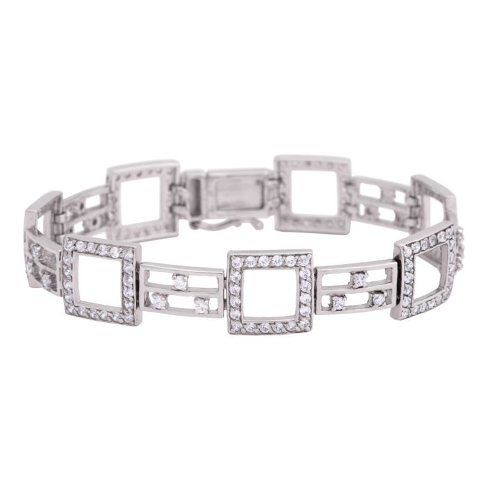 Das 12 mm breite Armband aus zirkonia-besetzten offenen Quadraten und Stegen hat ein Kastenschloss mit Sicherheitsacht.