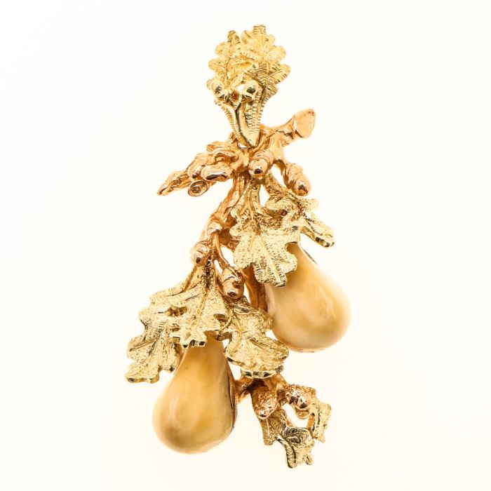 Das Schmuckstück ist in grün-stichigem Gold für die Eichenblätter und Rotgold für das Astwerk gearbeitet.