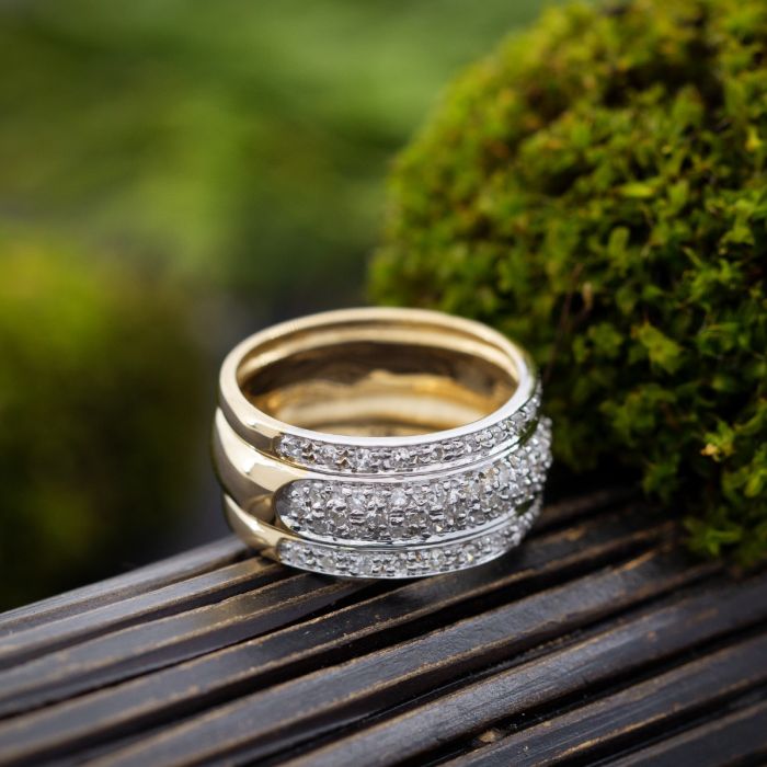 Die dreifach gewulstete Ringschiene ist zur Hälfte Gelbgold und glänzend poliert, die andere Hälfte in Weißgold ist vollständig ausgefasst mit insgesamt 50 Diamanten in Achtkantschliff und Pavéfassungen.