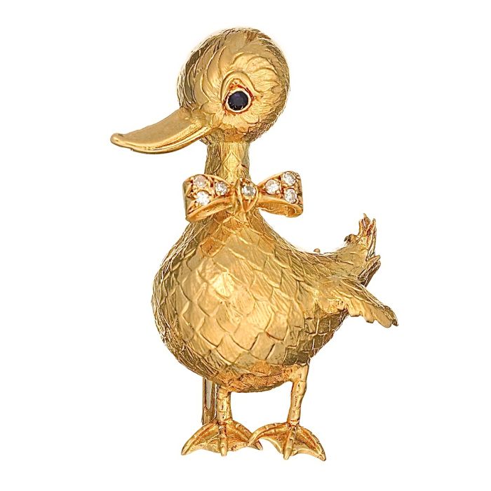 Halbplastisch ausgearbeitete Ente mit blauem Saphir als Auge, diamantbesetzter Schleife und fein strukturiertem Federkleid in schwerer Ausführung.