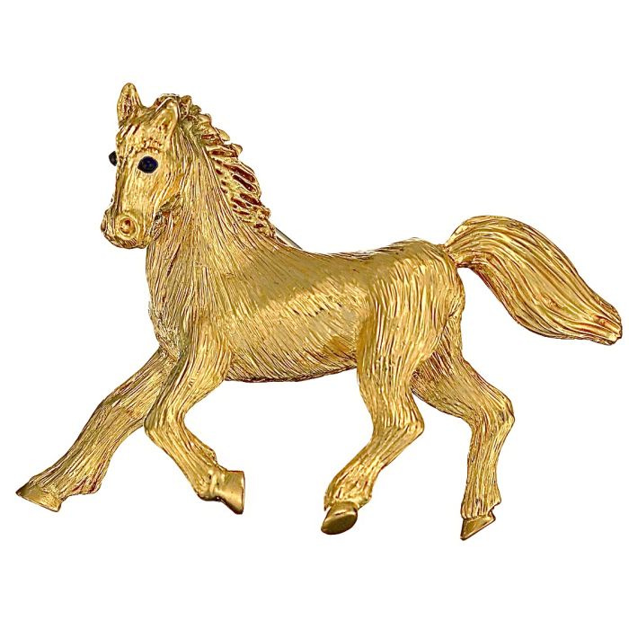 Halbplastisch ausgearbeitetes trabendes Pferd; mit ausgearbeiteter Fellstruktur, wehendem Schweif und Mähne sowie zwei kleinen runden Saphir-Cabochons als Augen; in schwerer Ausführung.