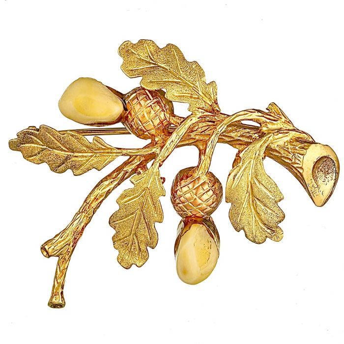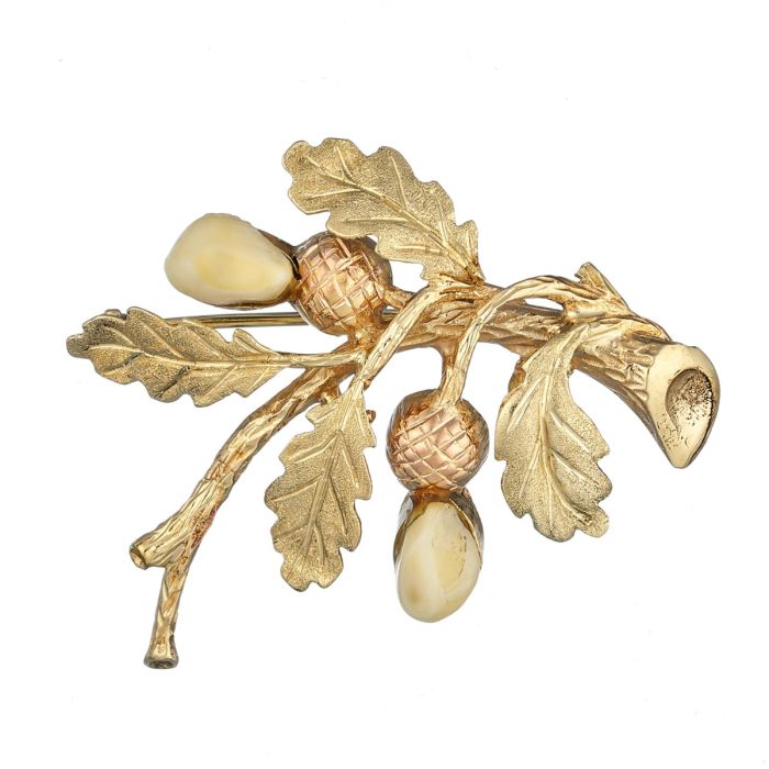 Jagdschmuck, Trachtenschmuck! Bicolor-Grandelanhänger mit grün-stichigem Gold für die Eichenblätter und Rotgold für das Astwerk, besetzt mit zwei Grandeln als Baumfrucht.