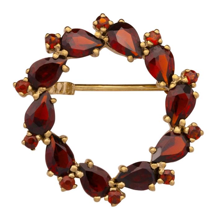 Das Schmuckstück fasst insgesamt 10 Granate in Tropfenform. Seitlich von diesen zieren zusätzlich 10 kleine runde Granatsteine die Brosche. Alle Steine sind in Krappenfassungen gesetzt.