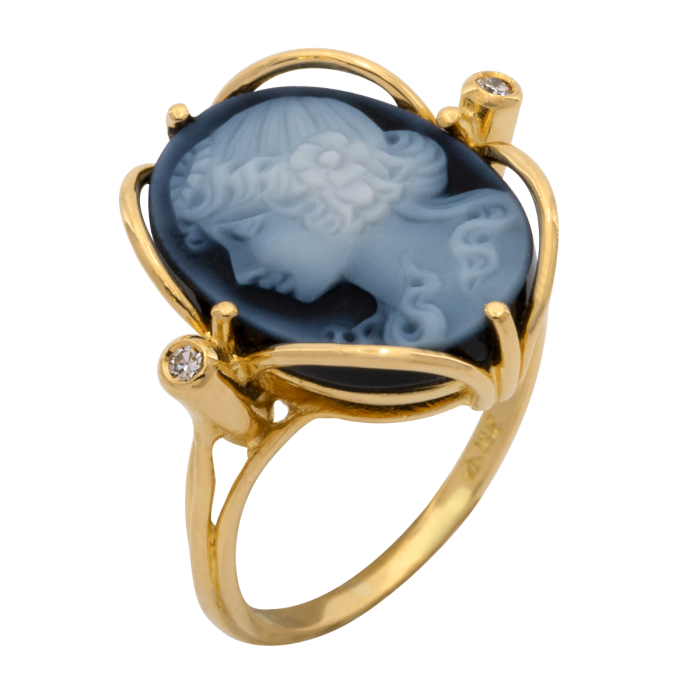 Als Gemme gearbeitet zeigt er die Büste einer Göttin, nach links schauend mit Blütenkranz im Haar. Flankiert wird er von je einem kleinen Brillant.