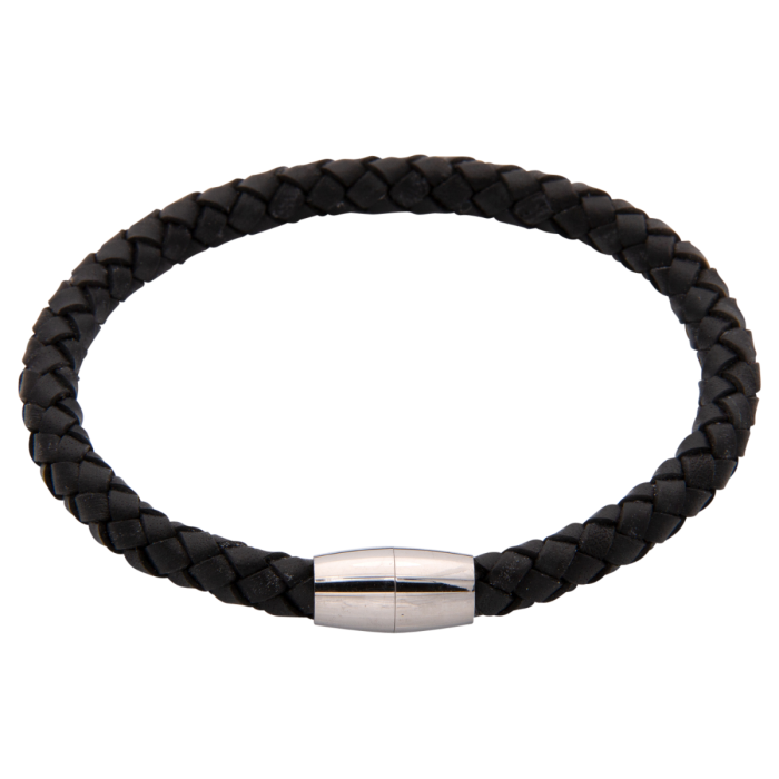 Das 7 mm dicke schwarze Lederband ist geflochten und hat einen Edelstahl ummantelten Magnetverschluss.