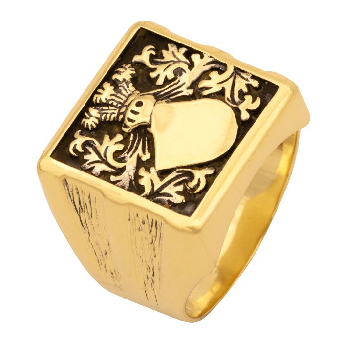 Die Ringschiene geht direkt in den eckigen Ringkopf über. Dieser zeigt ein Wappen mit floralen Ranken auf einem Patina gearbeiteten Untergrund.