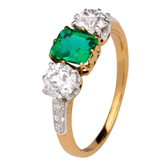 Die schmale hochglanzpolierte Ringschiene geht in den faszinierenden Ringkopf über. Dieser ist mit einem funkelnden Smaragd in Krappenfassung besetzt, welcher flankiert von Altschliffbrillanten wird.