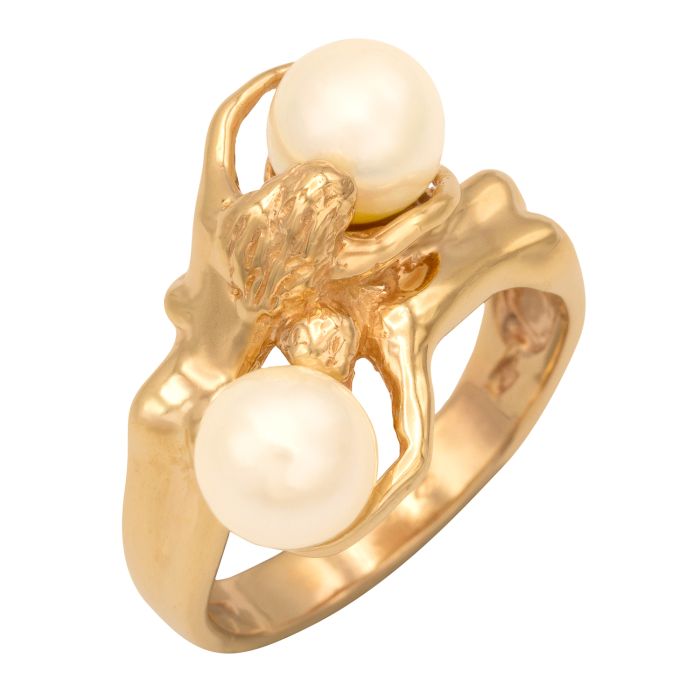 Das Schmuckstück hat eine schlichte, hochglanzpolierte Ringschiene, die im Verlauf zur Schauseite ein sich gegenüberliegendes Pärchen darstellt.