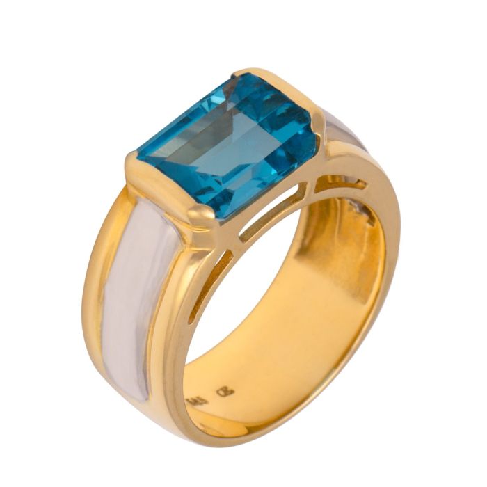 Das Schmuckstück, welches entlang der Ringschiene eine reliefartige Musterung aus Gelb- und Weißgold hat, fasst mittig einen funkelnden synthetischen Blautopas in Emerald-Schliff, der unter Garantie die Blicke auf sich zieht.