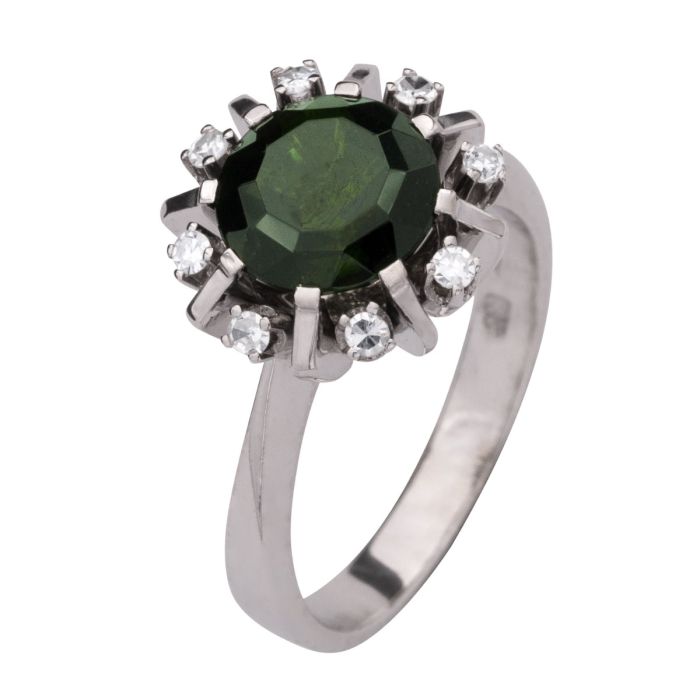 Der Ringkopf fasst mittig einen dunkelgrünenTurmalin, der von 8 Diamanten von ca. 0,12 ct. in Achtkantschliff entouriert wird.