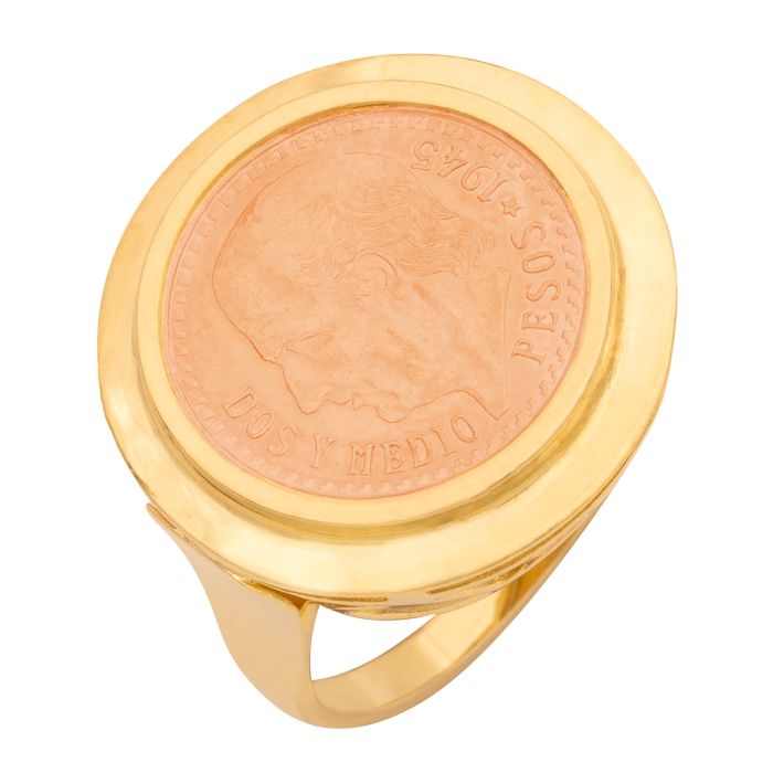 Das Schmuckstück hat eine profilierte, runde Zargenfassung, in der eine 2 ½ Pesos Münze Mexiko 1945 gefasst ist.