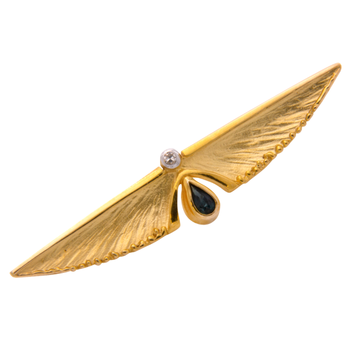 Sie ist aus 333er Gelbgold gefertigt und fasst einen tropfenförmigen Saphir sowie einen kleinen Diamanten mittig.