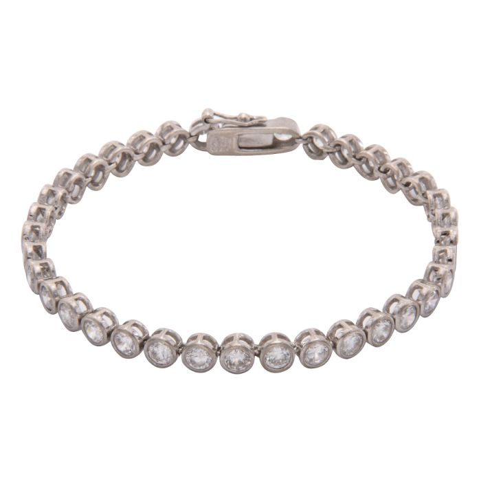 Runde Glieder reihen sich an der Armkette aneinander. In jedem Element sitzt ein weißer Zirkonia, der den edlen Armschmuck zum Funkeln bringt. Die glänzenden Teile bestehen aus 925er Silber, der das harmonische Design abrundet. Ein Steckverschluss inklusive Sicherheitsachter sichert das Armband am Handgelenk.