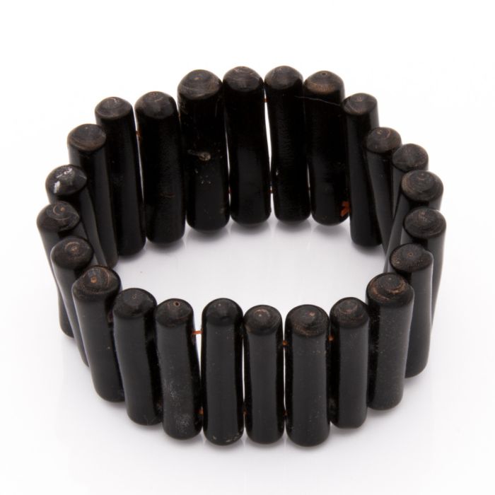 Armband mit aneinandergereihten Stäbchen aus Holz. Diese sind schwarz lackiert.
