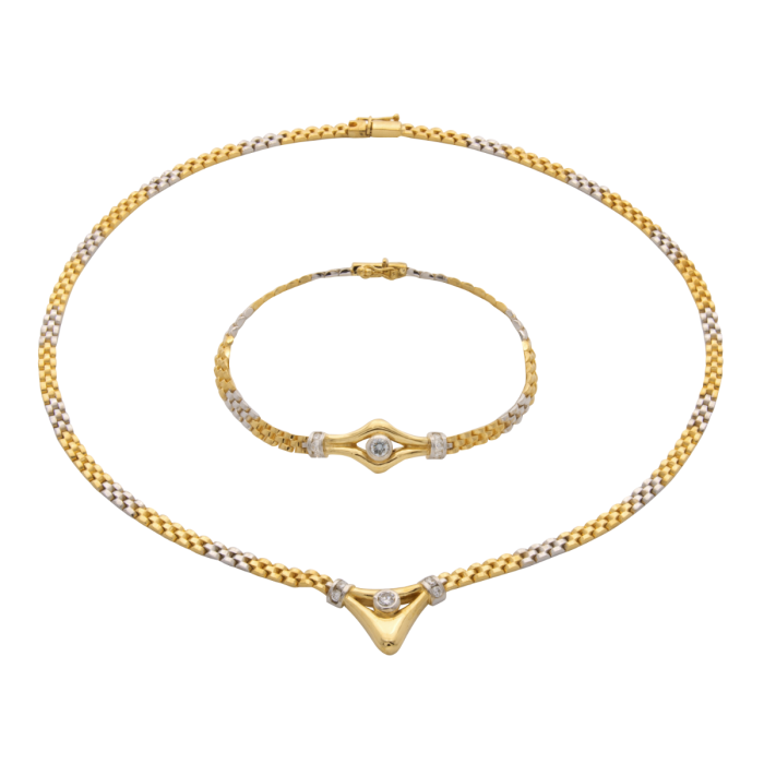 Das Schmuckset besteht aus einem Armband und einem Collier in 750er Weiß- und Gelbgold.