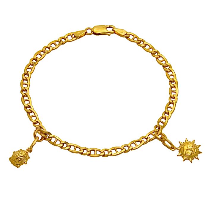 Das Armband ist aus 750er Gelbgold gefertigt, es hat Stegankerglieder und die niedlichen Anhänger sind ein Marienkäfer und eine Sonne.