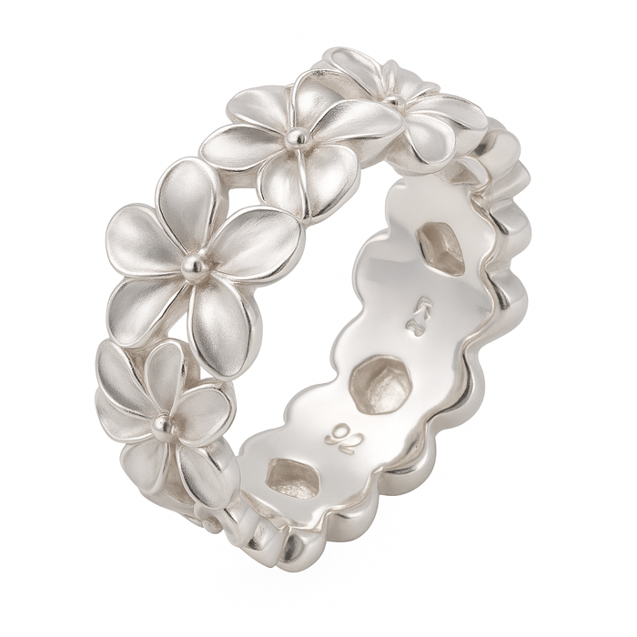 Massiver Damenring in 925er Silber. Es reihen sich um den ganzen Ring Blüten aneinander. Diese sind mattiert gearbeitet.