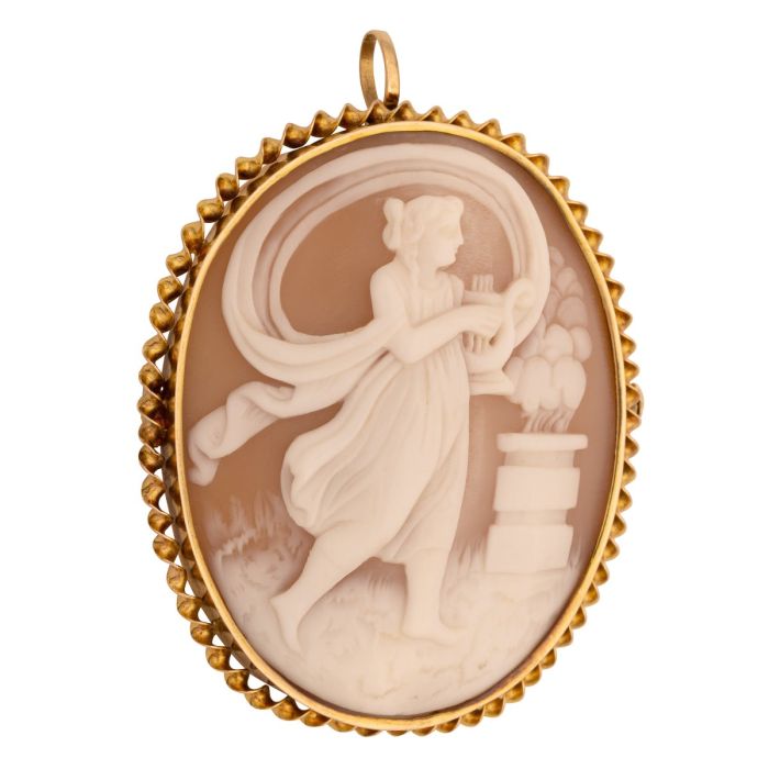 Das Schmuckstück hat eine ovale Form, die einen kordelförmig gearbeiteten Rahmen hat.