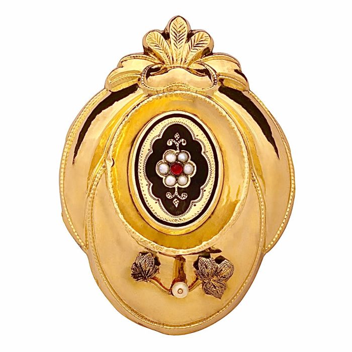 Die Brosche in der ovalen Form mit seinen geschwungenen Volutenmotiven wird mittig geziert von kleinen Saatperlen und einem Rubincabochon. Umrandet ist es von einer Emaillebemalung.