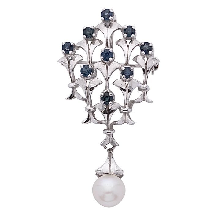 Brosche/Anhänger in Weißgold mit Saphiren und Zuchtperle