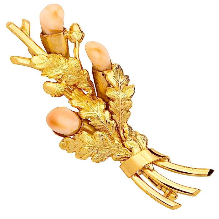 Die Brosche hat Grandeln (bezeichnet den Eckzahn von Wiederkäuern) gefasst, welche die Baumfrucht darstellen. Diese sind umgeben von filigran gearbeitetem Eichenlaub aus Gold.