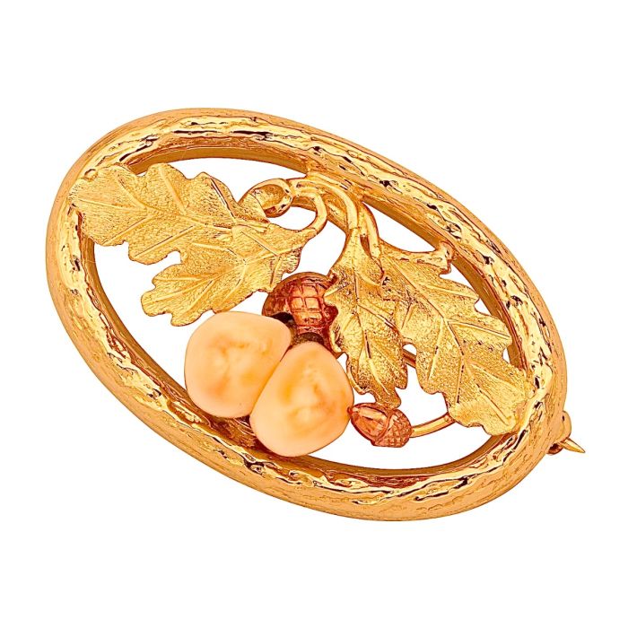 Die Brosche in ovaler Form fasst ein Grandelpaar (bezeichnet den Eckzahn von Wiederkäuern), welche die Baumfrucht darstellen. Die Hülle der Frucht ist in Rotgold gehalten. Sie sind umgeben von filigran gearbeitetem Eichenlaub aus grünlich schimmerndem Gold.