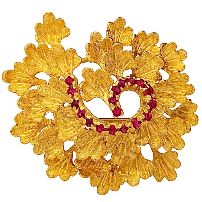 Liebevoll gestaltete Brosche mit Rubinen
